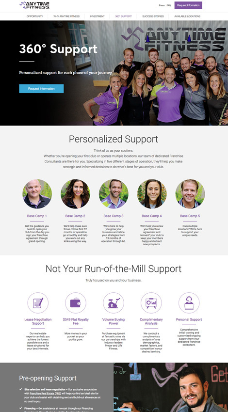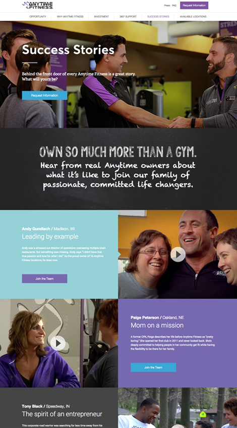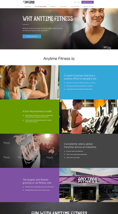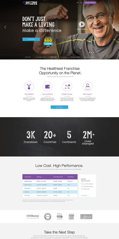 Anytime Fitness is a chain of 24-hour health and fitness clubs with 3,000 franchise locations dispersed throughout 20 different countries. The brand was interested in expanding their reach to potential franchisees, and Pelorus Digital Media designed a website that provides those potential franchisees with all of the information they need to own and operate an Anytime Fitness location.