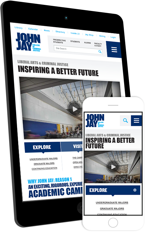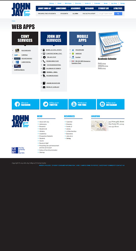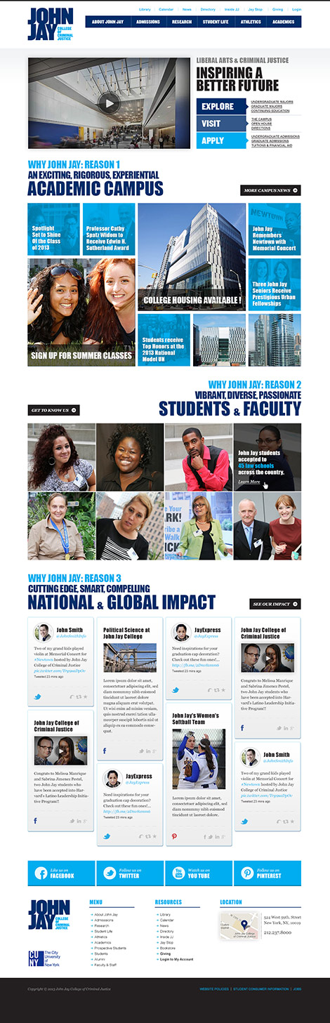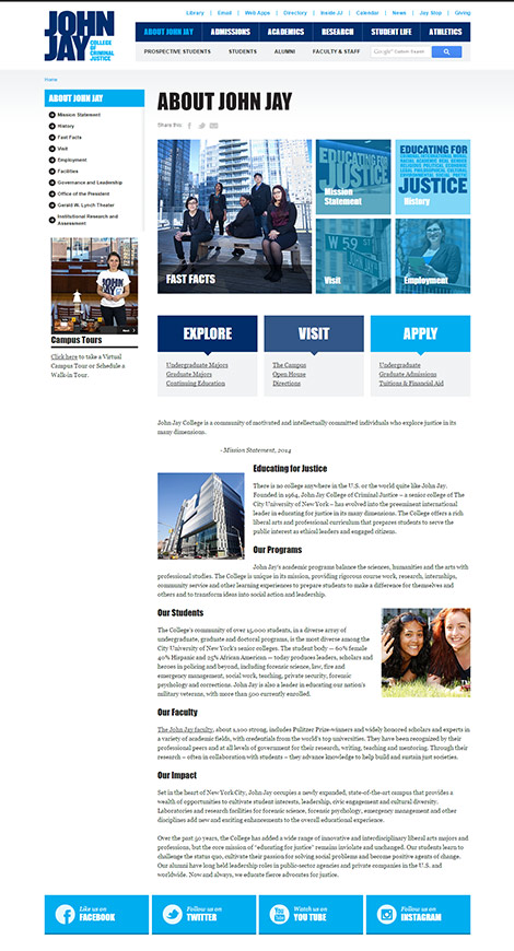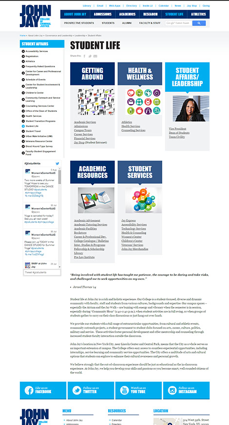Pelorus Digital Media restructured their website design from the ground up with a site map that included thousands of pages cleanly and succinctly. A flexible, modular system was created in order to allow multiple authors at John Jay to regularly update the site based on changing academic needs. The website also aggregates two-way social media channels, both from numerous John Jay feeds as well as student-generated content.