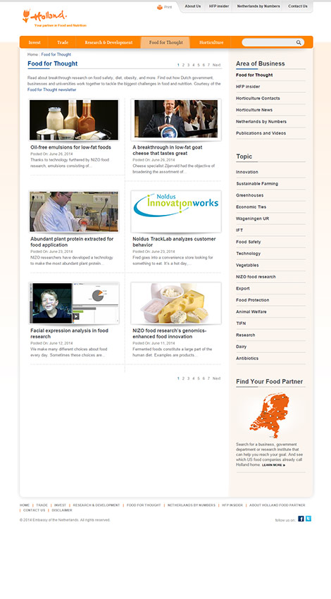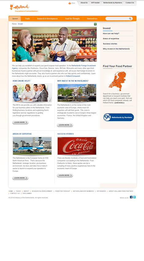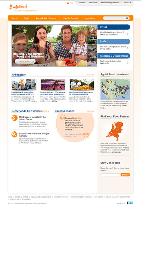 The first was Holland Food Partner, a platform to facilitate partnerships between the American food industry and Holland’s agriculture organizations. The second collaboration resulted in the development of the website economicties.org which showcases the strong economic links between the USA and the Kingdom. In addition PDM designed the companion brochure to translate the online experience into offline engagement.