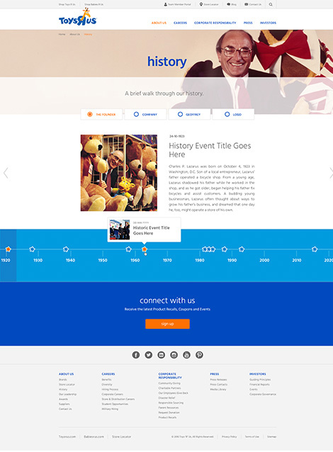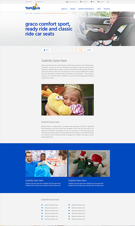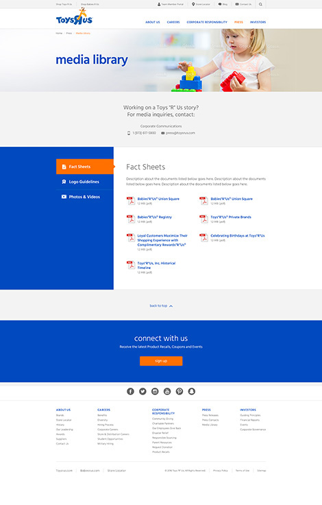 Toys R Us is the world's leading toy and baby product retailer with over 1600 global locations. Their corporate website provides audiences with the necessary resources to learn about the brand's commitment to providing shoppers with a great experience, while serving the communities they are a part of.